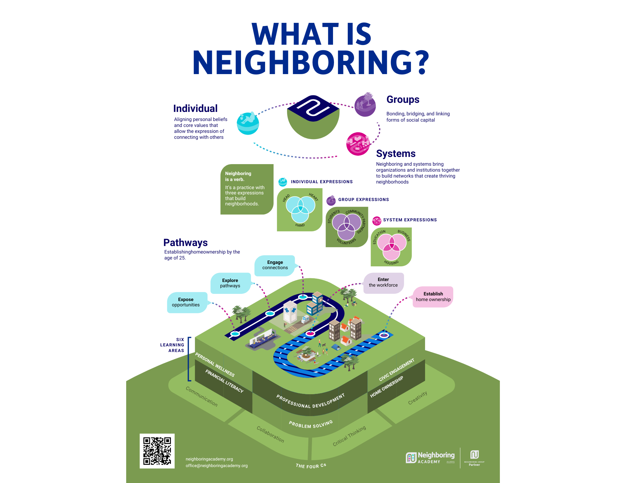 The Neighboring Academy is organized into 8 developmental modules that progressively challenge and support high school students in their 21st Century Skills (“4 C’s”: Communication, Collaboration, Critical Thinking, and Creativity) within the following 6 general learning areas (GLA’s): Financial Literacy; Personal Well-being; Civic Engagement; Problem Solving; Professional Development; and Homeownership.